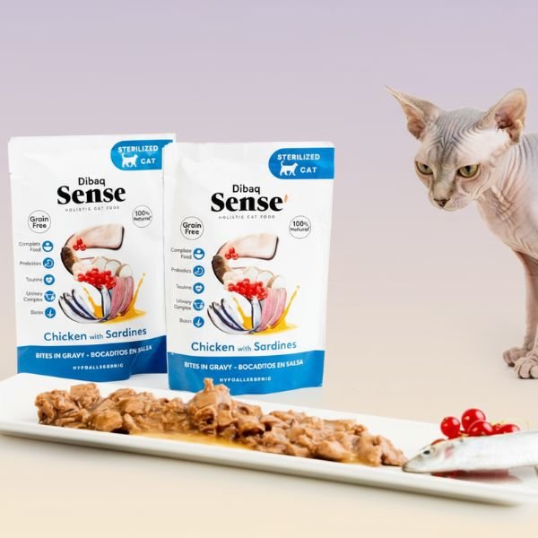 Los Dibaq Sense Bocaditos en Salsa Pollo con Sardinas son un alimento completo, natural y de alta calidad, formulado para gatos esterilizados y adultos que necesitan una dieta equilibrada, rica en proteína y con beneficios funcionales.