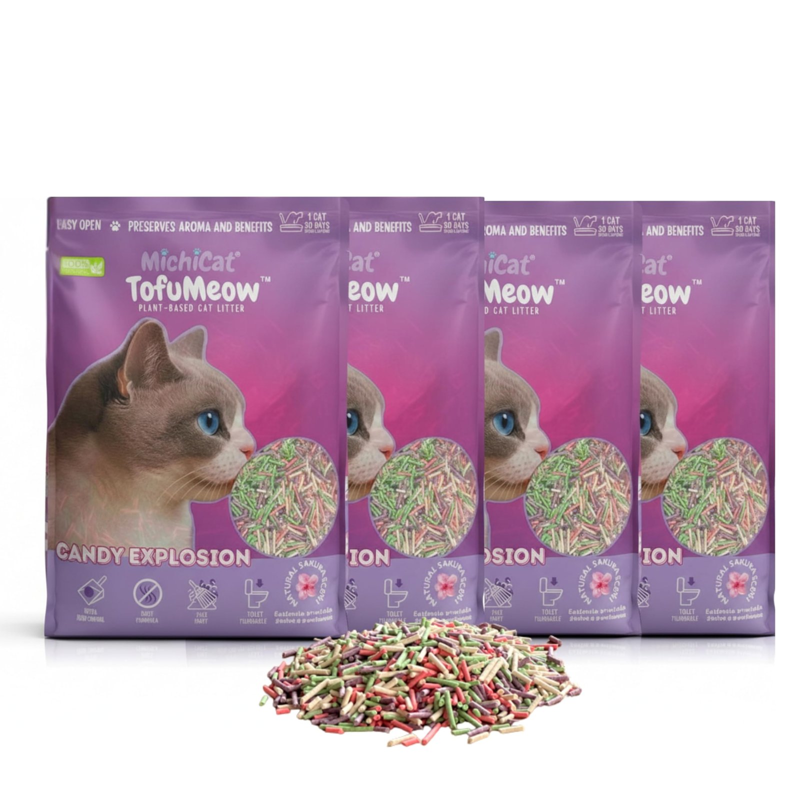 MichiCat Arena de Tofu para Gatos TofuMeow, 12 kg (4x3kg) Arena Aglomerante para Gatos Vegetal Biodegradable, Libre de Polvo, Control de Olores Avanzado, Desechable en WC, Pack Ahorro Larga Duración
